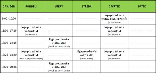 Přehled všech mých aktuálních cvičení Jógy pro zdraví a vnitřní klid v Ústí nad Labem